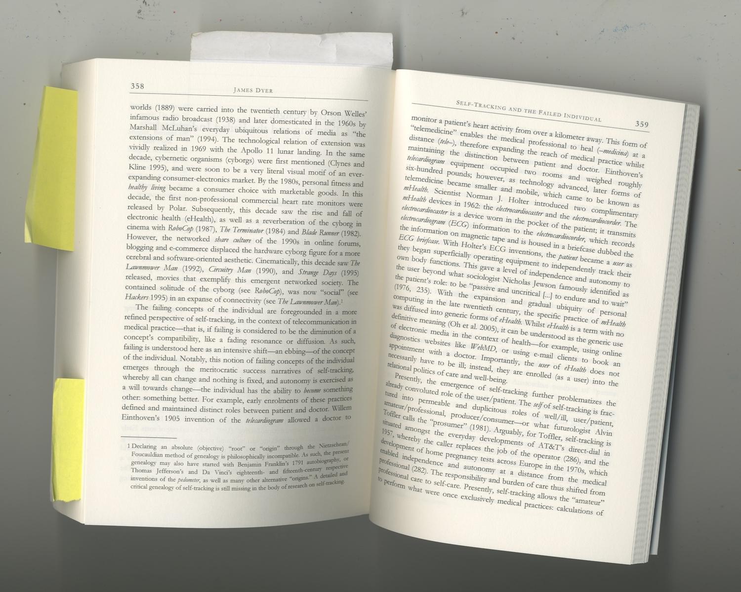 Self-trackers are a diffuse and diverse group that quantify their lives. From the ordinary to the extraordinary, intimate and vital happenings that occur on (infra)-empirical planes are cast as legible events. The tracked data consists of blood pressure, heartbeat rate, testosterone levels, posture, diet, muscle tension, social activity or geographical position. These are now happenings to be intervened upon and rendered as units of measurement and comparable variables. These measurements may give insight to help rebuild a recognition of oneself (Catani 2015), or allow a brooding recall of lost moments (Kalina 2012) – this is the manifest quantified body, a body read and a body written.