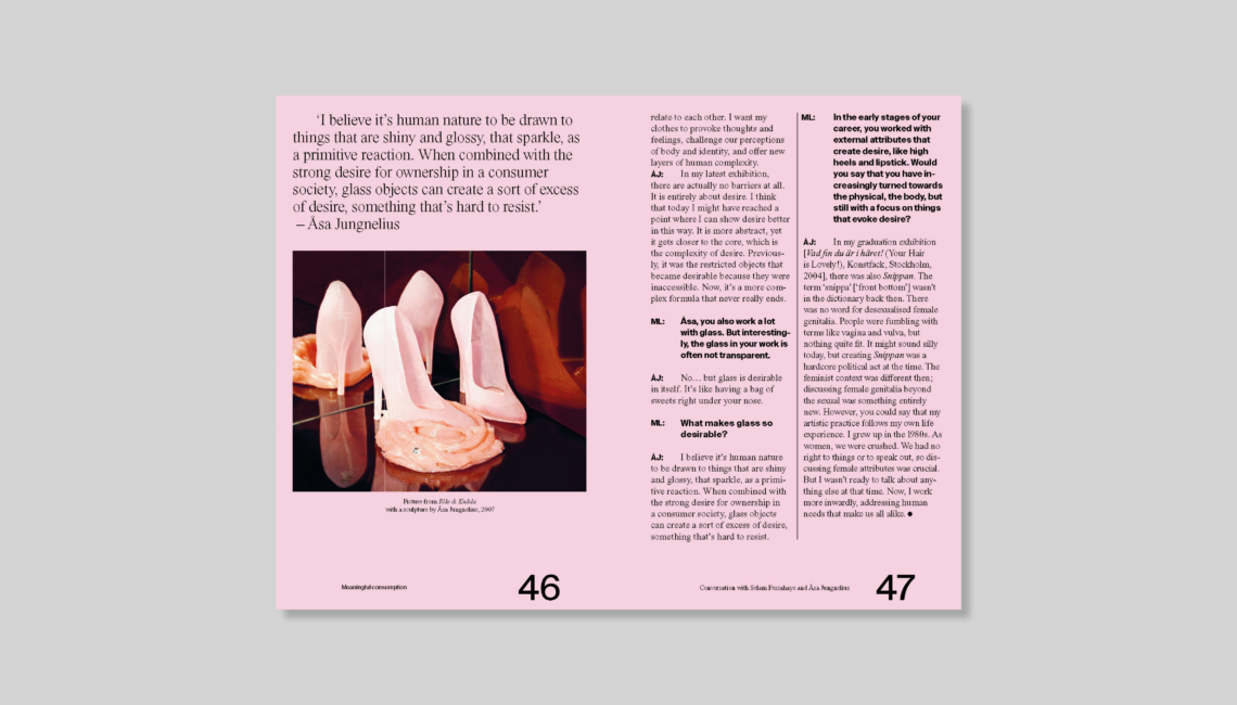 The bulk of the book is split into six themes: Desire, Innovation, Creativity, Efficiency, Change, Belonging. Each theme is made up of three parts. First is a conversational interview with designers and artists working in contexts loosely associated with the theme — a designer and a CEO for “efficiency”, a fashion designer and a glass artist for “desire”, and so on. They read as light, pop design journalism offering just enough insight to get beneath the surface of the works without too much confounding detail or jargon. This is followed by a set of full-bleed, bright and bold photographs capturing the theme “outside of the museum’s walls”. Closing each theme is a short essay that tends to be theme-adjacent rather than head-on critical takes on the theme itself. For instance, under the theme of “innovation” John Redström writes about the problematic importance of machines in design’s history, and under the theme of “efficiency” Thomas Cubbin questions the assumed role of the designer as “optimiser”. Further distinguishing the changes of themes are the pastel-coloured paper stocks, a different one for each theme. The photographs, which are sandwiched in the middle of each pastel block, are printed on contrasting magazine-weight glossy paper. Along with its heft, these editorial designs make the book feel like a well organised, contemporary collection of diverse materials put together for readers interested in the contemporary challenges of curating design, crafts and fashion today.